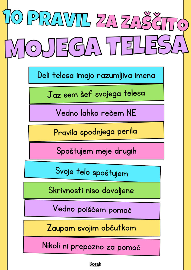 Za vse starše, vzgojitelje, učitelje in vse odrasle, ki so vam v varstvo zaupani otroci je tukaj brezplačen PDF plakat. Gre za uporabno gradivo, ki vam lahko pomaga pri pomembnih pogovorih in vzgoji o osebnih mejah in varovanju otrokovega telesa.